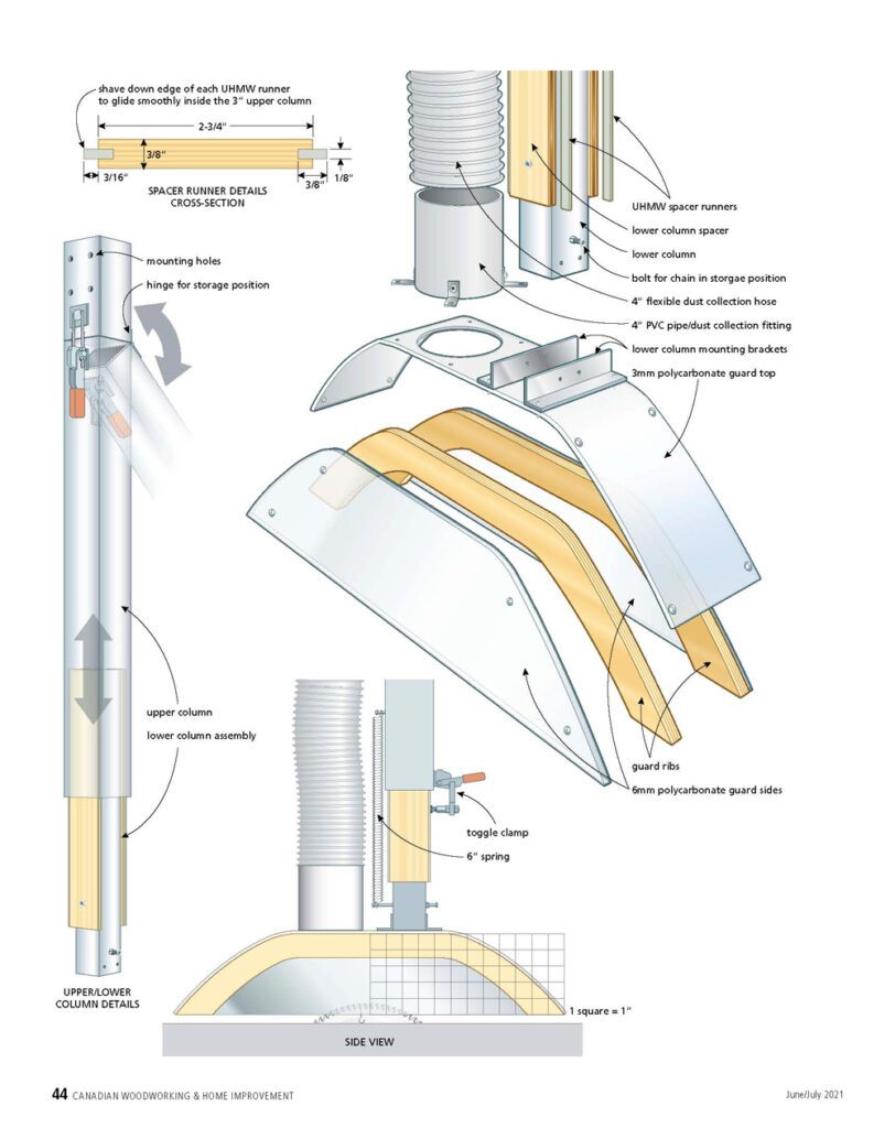 This inexpensive, relatively easy to make table saw guard is packed with features. Personal safety and improved dust collection are top priorities in this design.