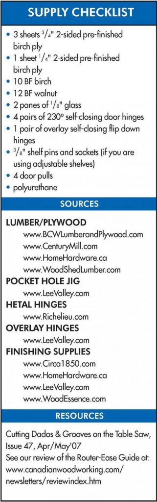 I used two-sided pre-finished birch plywood for the tops, bottoms, sides and backs, and spalted maple and black walnut for contrast and accents. I was fortunate to find the spalted maple in a second hand shop on Saltspring Island that was already re-sawn and planed to 316″.