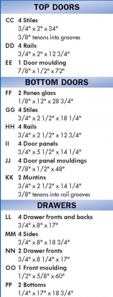 • Mill stock for the drawer fronts and backs (LL) and sides (MM).