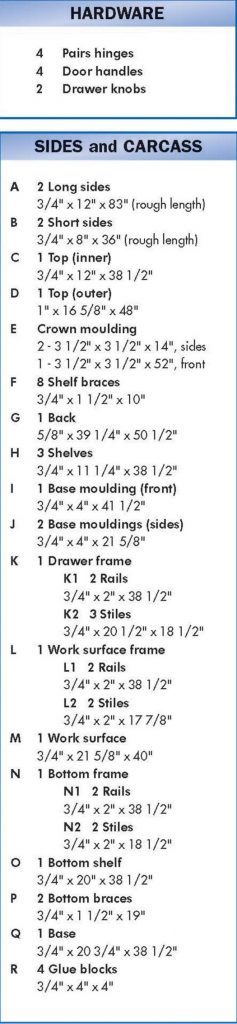 • Mill stock for work surface shelf (M). Once the carcass is assembled you will cut it to fit into the space between the sides. Some block planing may be required to achieve a perfect fit.