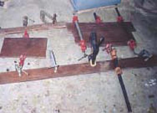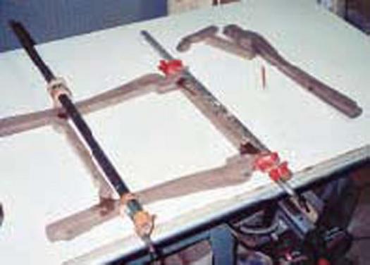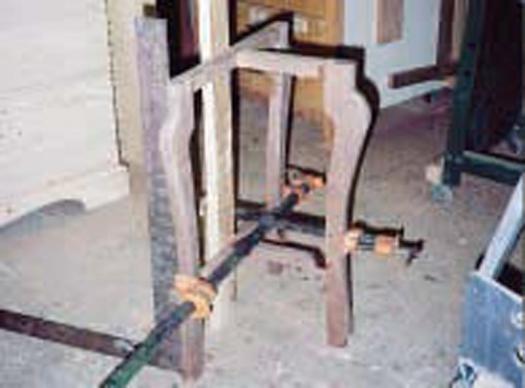 On the full length stringer and cleat (#2 & #4), apply glue to the tenons and insert them into their mortises. Gently pull the joints together with pipe or bar clamps. If excess glue was used, allow the glue to be gently squeezed out of the joint. If excessive force is used, the parts may split from hydraulic pressure. Make sure the assembly is flat. Check that the assembly is square by comparing diagonal measurements, adjusting as necessary. Wipe up squeezed out glue thoroughly with a wet rag.