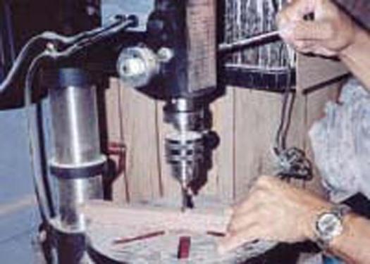On each leg, cut two more mortises in the same manner. The locations of the mortises are marked on the grid diagram. When drilling the lower mortise, make sure to prop up the part as required to drill the mortise parallel to the top & bottom of the leg. Square up the mortises with a chisel and test fit the parts.