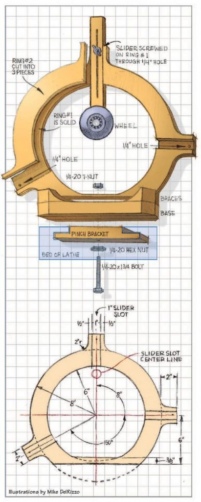 This design is for a 12″ lathe. For a different sized lathe make the inner radius ½ the lathe capacity (i.e. 5″ for a 10″ lathe). Add 2″ to that for the outside radius. Adjust the width of the base and the length of the sliders to suit.