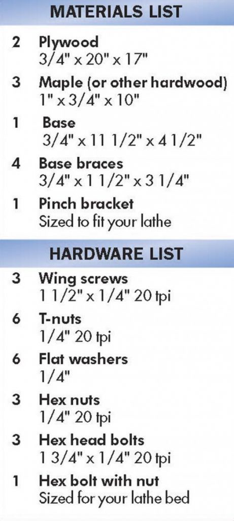 Assemble the base and braces (as shown). To use the jig, bolt it to the lathe, adjust the top wheel first, then the back wheel so they just touch the work piece. Then, adjust the front wheel to exert only slight pressure on the work piece.