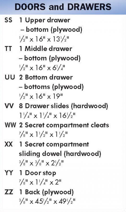 A solid bottom is required for the center cupboard and the secret compartment. These bottoms fit into the existing grooves machined in the sides of the front and back tread rails. A tenon must be machined on the edges of the bottoms to fit into the grooves.