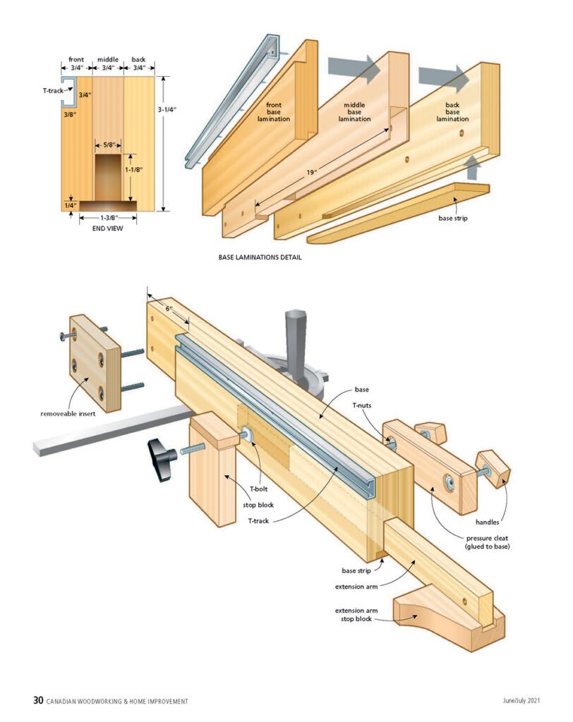 I did use some metal in this jig, though. Metal is the perfect material for a lot of the hardware that will keep a jig like this working for years to come. A standard mitre gauge forms the foundation for my jig. It fits in my table saw’s mitre slot, allows me to angle the jig in relation to my blade and is super durable. T-track allows me a lot of options for making wood stops that will give me the repeatability I need. That, coupled with T-bolts, makes for a sleek solution. Some additional miscellaneous 1/4-20 hardware helps bring this jig together in a clean, strong and lasting manner.