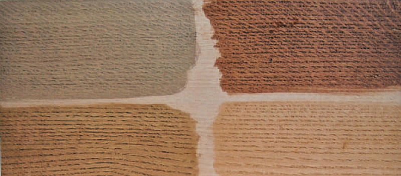 Clockwise from top left: Minwax Water Based “American Walnut”; Minwax Wood Stain “English Chestnut”; Minwax Gel Stain “Aged Oak”; Minwax PolyShades “Antique Walnut”