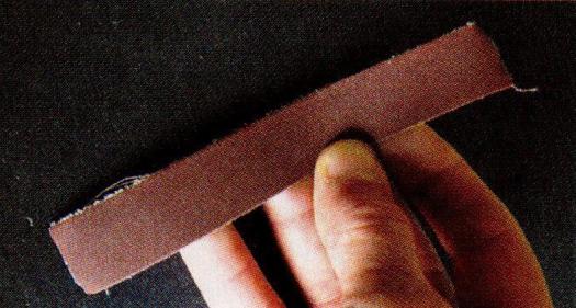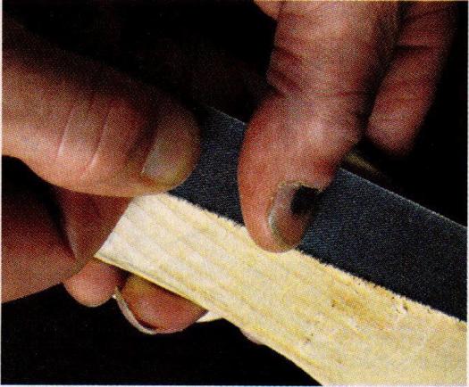 After scraping, I use strips of cloth-backed sandpaper. Press the sandpaper against the wood with one thumb. Using your other hand, pull the sandpaper across the wood under your thumb. It is important to sand with the grain and in only one direction. This technique eliminates the ‘fuzzing’ that always occurs when you rub sandpaper back and forth across wood grain. Sanding this way is very fast. When you sand in only one direction (with the grain), the task can be completed in minutes instead of hours.