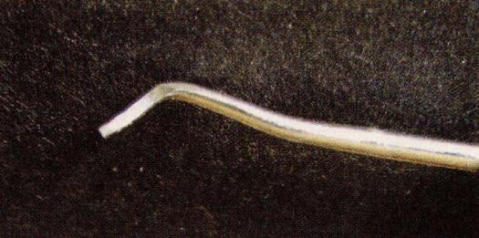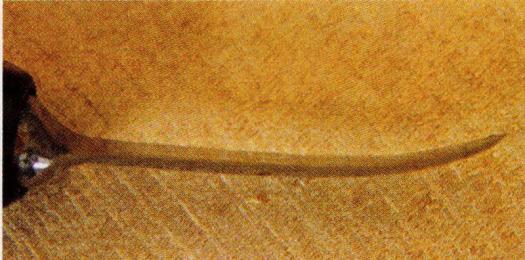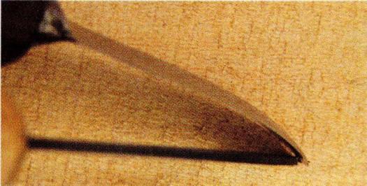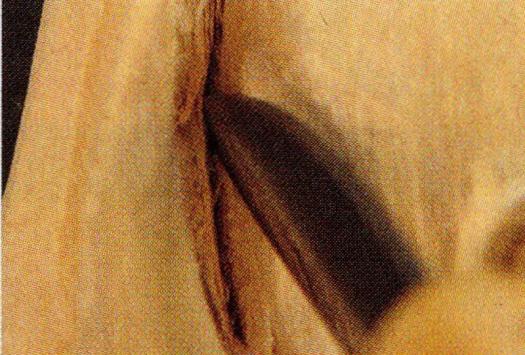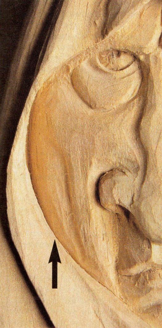 When carving a deep crevice, many people have difficulty removing the deepest chips of wood. The solution is all in the angles of cuts… and a little patience. First, it is necessary to make a strong vertical cut that will provide an edge from which wood will be removed. Then, use a curved tip knife to cut away the wood beside the vertical cut. The bent tip creates a slightly less acute angle deep in the crack.