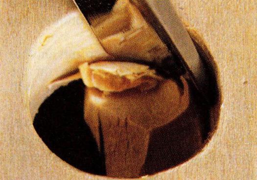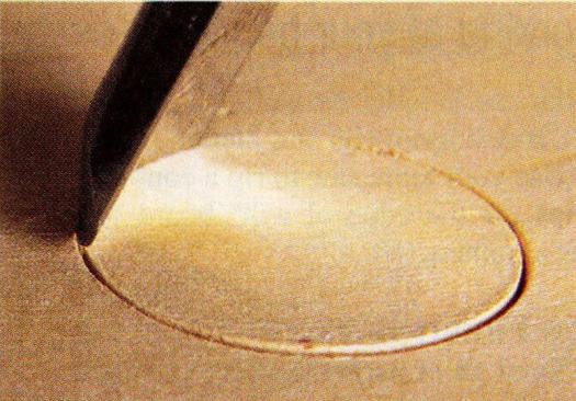 A well-made gouge will inscribe a perfect circle. Begin by inscribing a circle where you want the hole. Be sure to keep the beveled edge of the gouge vertical. Remove the wood inside the circle using the same gouge. Repeat the process as many times as necessary, always keeping the beveled edge of the gouge vertical. Care is necessary when the exit side of the hole is reached. Twist the gouge as you cut your way out of the wood in order to prevent splintering the exit side. If you are careful, your gouge-drilled hole can be as accurate as anything you would get with a drill.