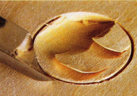 It is most important that you make a good effort to remove the wood chip. Often, a carver will shave off several new slices of wood when trying to remove a piece that is already detached. To extract difficult slices, a dental tool can be quite useful. Many dentists will give you the tools they are discarding.