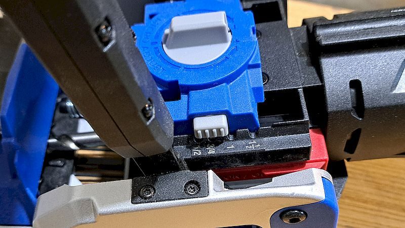 - Tool-free micro adjustments for both material thickness and bit depth.