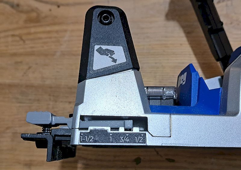 Setting up the Rebel is straightforward. A lever beneath the front handle sets the material thickness (from 1/2″ to 1-1/2″). On top, you’ll find the drilling depth stop and micro-adjust dial. When drilling into 3/4″ material, I simply match both the material setting and depth stop to 3/4″. That keeps the bit from fully breaking through.