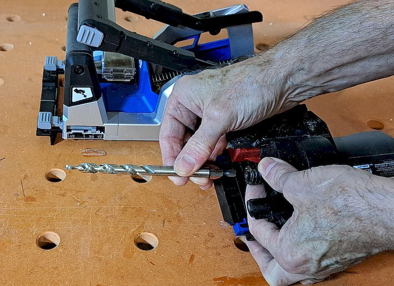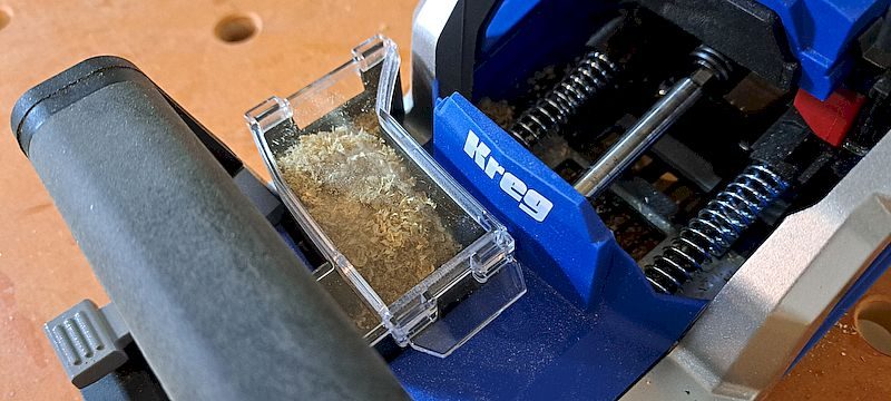 Pocket-hole drilling doesn’t create nearly as much dust as sanding or routing, but I still get better visibility (and a cleaner shop) by using a vacuum hose. The onboard dust bin fills after about a dozen holes, and debris starts spilling onto the work surface. The vacuum port doesn’t match Festool or Bosch hoses directly, so, like me, you may need an adapter.